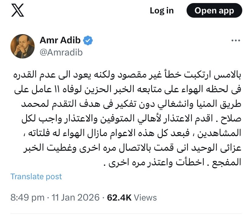 اعتذر الإعلامي عمرو أديب عن عدم متابعته خبر وفاة 11 عاملًا على طريق