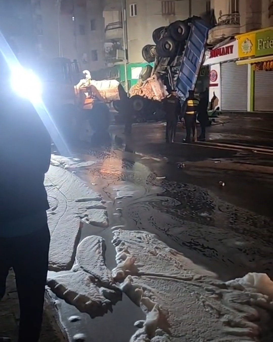 مديرية أمن الجيزة بلودر لرفع السيارة النقل وإزالة آثار الحادث.