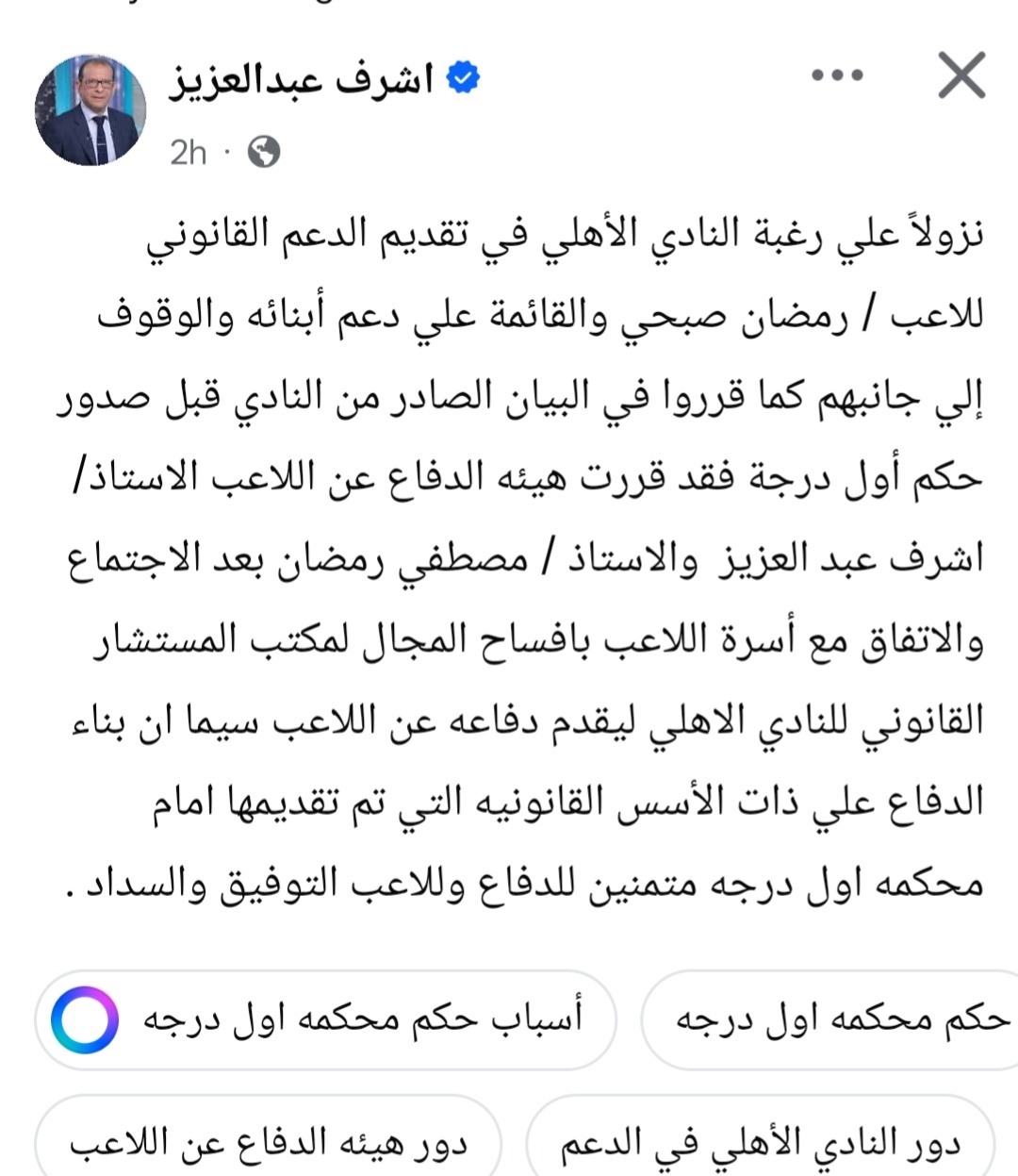 الأهلي في تقديم الدعم القانوني للاعب رمضان صبحي والقائمة علي دعم أبنائه والوقوف