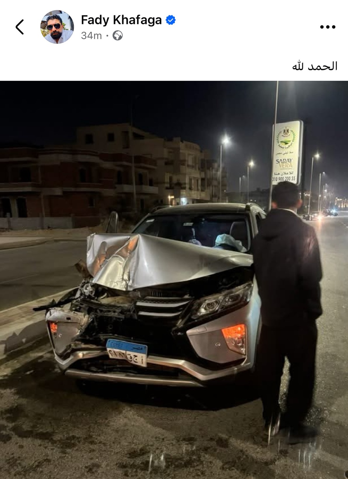 وقام خفاجة بالتعليق على صورة سيارته المتضررة قائلًا: “الحمدلله”.