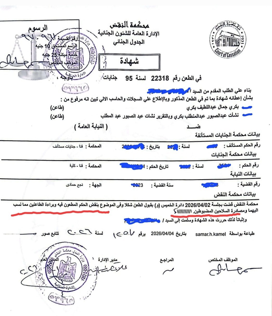 محكمة النقض المصرية بجلسة الدائرة الخميس الموافق 2 أبريل 2026 "و" في الطعن رقم 22318 لسنة 95 ق نجح المحامي الجنائي أشرف نبيل